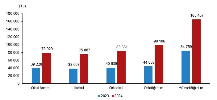 Öğrenci başına yapılan eğitim harcaması 2023 yılında 49 bin 45 TL iken, 2024 yılında 100 bin 307 TL oldu. Eğitim düzeylerine göre değerlendirildiğinde, 2024 yılında öğrenci başına harcamanın en yüksek olduğu eğitim düzeyi 165 bin 467 TL ile yükseköğretim oldu. Öğrenci başına yapılan eğitim harcaması, 2024 yılında bir önceki yıla göre ABD doları bazında %48,1 artarak 3 bin 53 $ oldu.