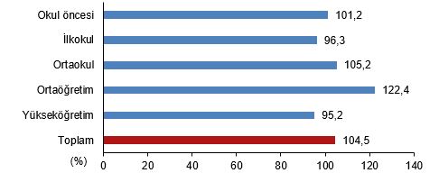 Öğrenci başına toplam eğitim harcaması bir önceki yıla göre %104,5 arttı. Öğrenci başına eğitim harcamalarının 2024 yılında 2023 yılına göre en fazla artış gösterdiği eğitim düzeyi %122,4 ile ortaöğretim oldu. Bunu %105,2 ile ortaokul takip etti.
