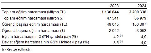 Eğitim harcamalarının gayrisafi yurt içi hasıla (GSYH) içindeki payı 2023 yılında %4,2 iken, 2024 yılında %4,9 oldu. Devlet eğitim harcamalarının GSYH içindeki payı ise 2023 yılında %3,5 iken, 2024 yılında %4,0 oldu.